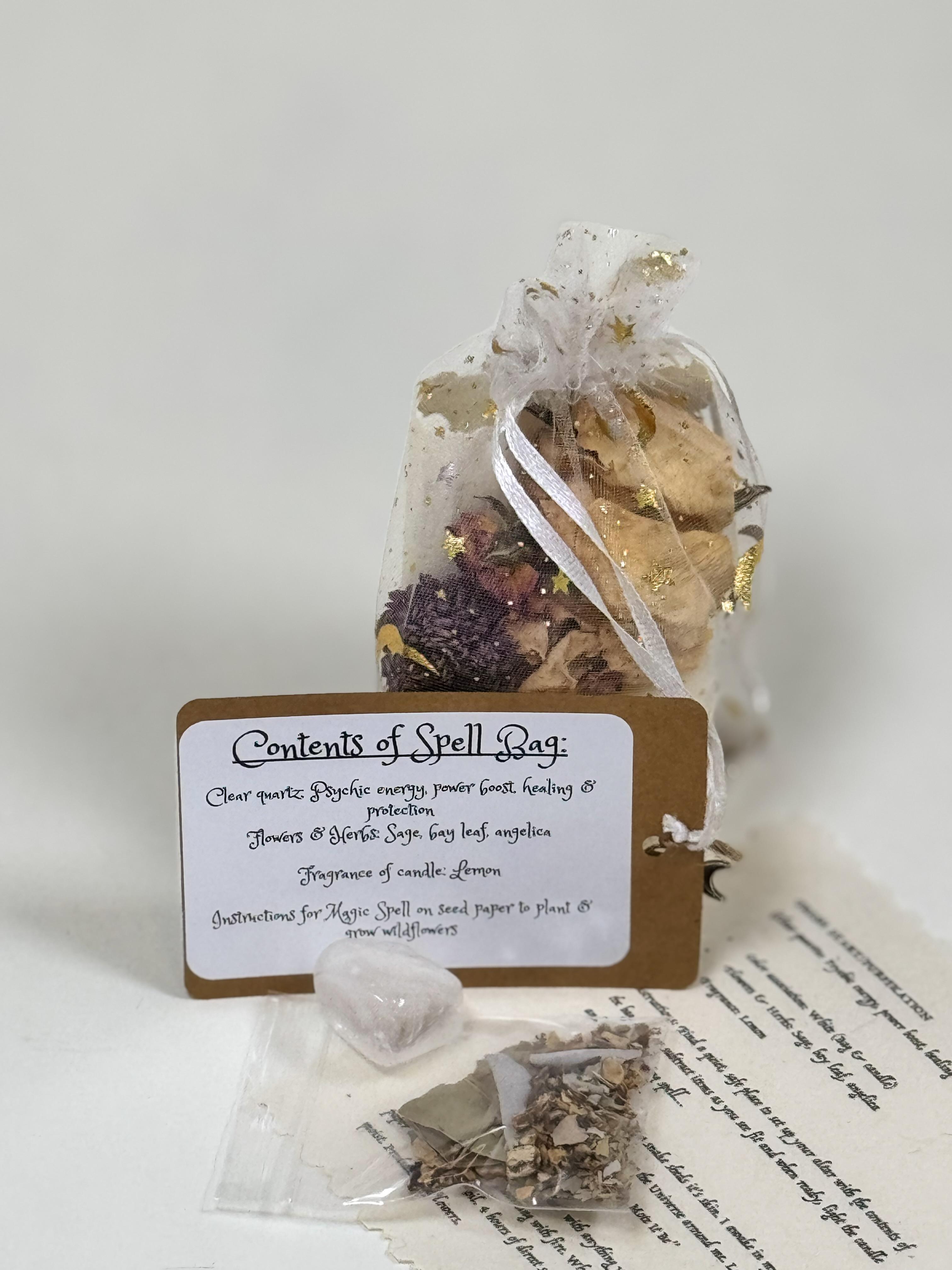 Each spell bag is handcrafted: small-batch candles, sustainable ingredients, handpicked flowers, and seed paper from Nepal.
