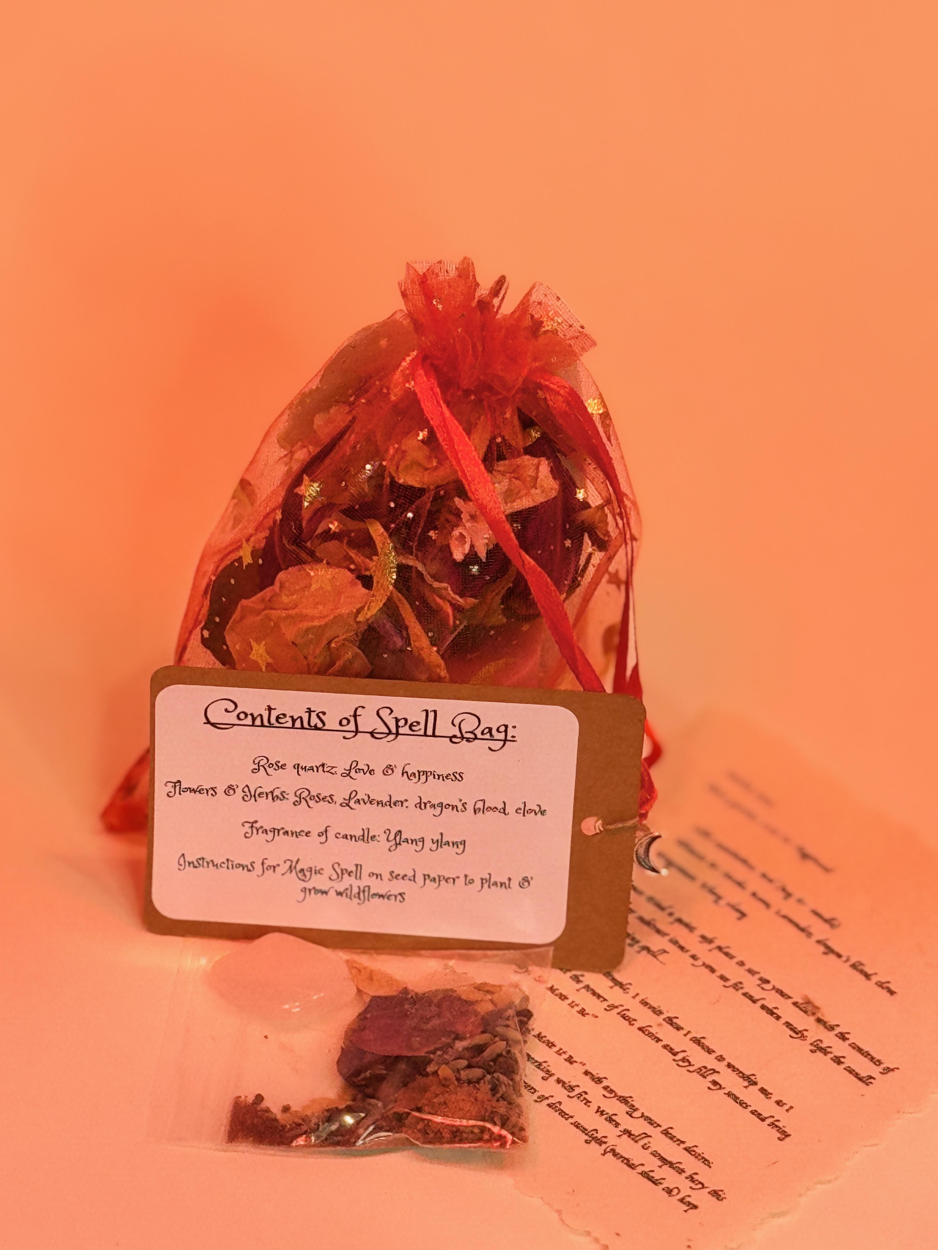Each spell bag is handcrafted: small-batch candles, sustainable ingredients, handpicked flowers, and seed paper from Nepal.