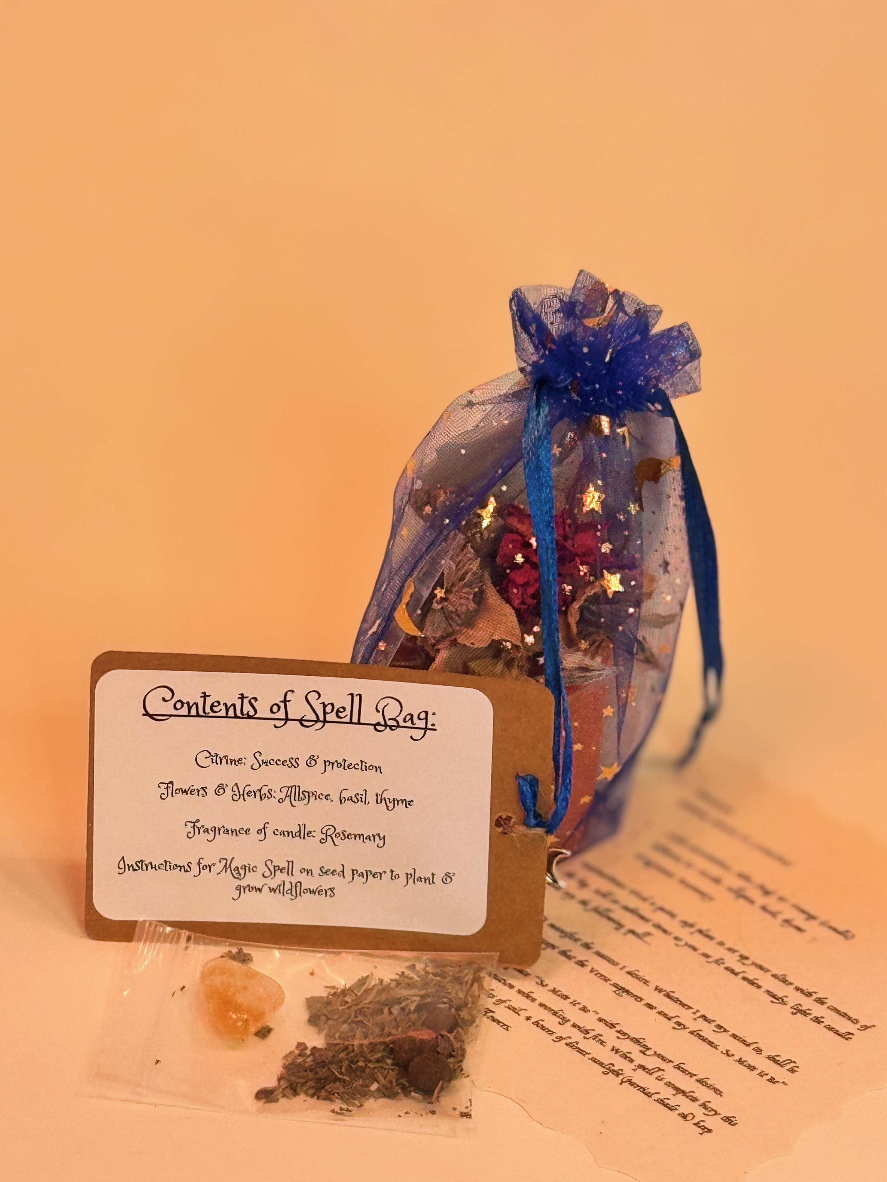 Each spell bag is handcrafted: small-batch candles, sustainable ingredients, handpicked flowers, and seed paper from Nepal.
